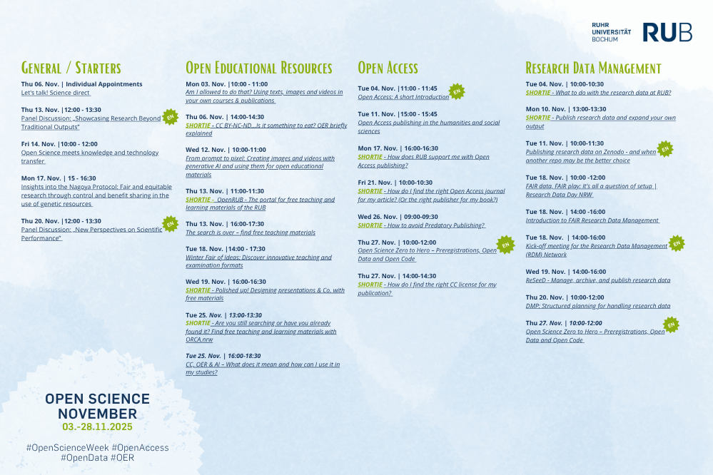 The Open Science Month takes place once a year at Ruhr University Bochum: Get information on Open Access, Open Data and Open Educational Resources and learn how to publish your publication as Open Access and share your research data or teaching materials with the community. Take the opportunity to discuss current developments and challenges in the Open Science community with experts and network with other Open Science enthusiasts.